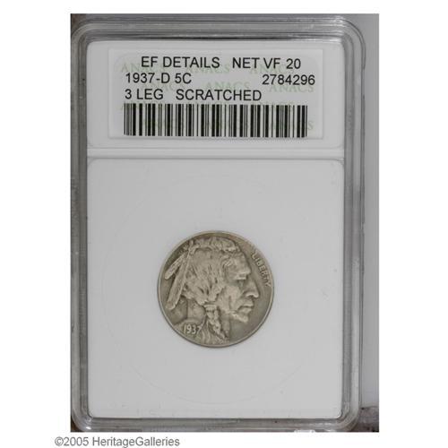 <B>1937-D<5C> Three-Legged--Scratched--ANACS. XF Details, Net VF20.</B></I> Gray surfaces are traversed by a thin diagonal scratch on the obverse, and a deeper diagonal scratch on the reverse.