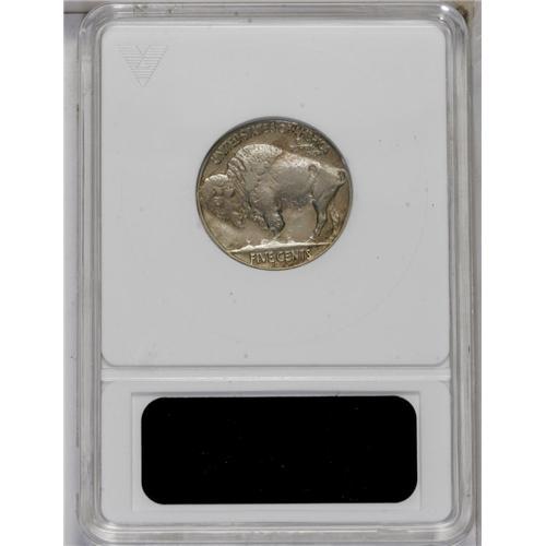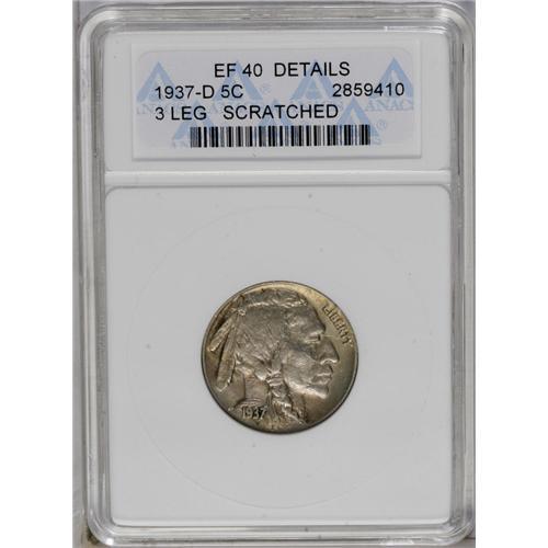 <B>1937-D<5C> Three-Legged--Scratched--ANACS. XF40 Details.</B></I> A mix of ice-blue and gold-beige patina bathes each side. Three or four obverse shallow scratches account for the "details" grade. Nevertheless, a decent example of this popular mint error.