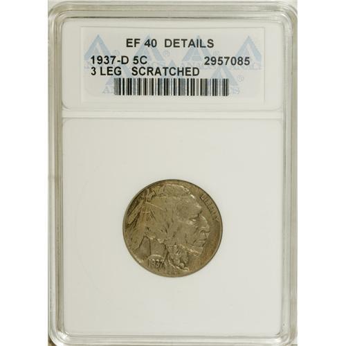 <B>1937-D 5C Three-Legged--Scratched--ANACS. XF40 Details.</B></I> The portrait appears unmarked when viewed with the naked eye, but a loupe reveals a few thin marks. A cloudy and moderately worn example of this classic collector variety.<BR><BR><b>Shipping:</b> Coins & Currency (<a target="_blank" href="http://www.heritageauctions.com/common/shipping.php">view shipping information</a>)