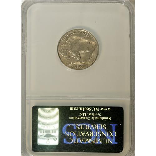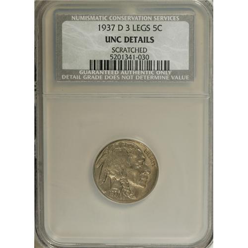 <B>1937-D 5C Three-Legged--Scratched--NCS. Unc Details.</B></I> The glowing greenish-gray surfaces betray no trace of wear, and while a scratch extends from the top of the Indian's hair to the cheekbone, the reverse has only light, scattered marks. Well struck, considering the die erosion typical for this issue.<BR><BR><b>Shipping:</b> Coins & Currency (<a target="_blank" href="http://www.heritageauctions.com/common/shipping.php">view shipping information</a>)