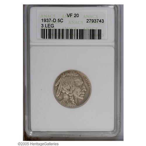 1937-D 5C Three-Legged VF20 ANACS. An evenly worn, lig 1937-D[5C] Three-Legged VF20 ANACS.