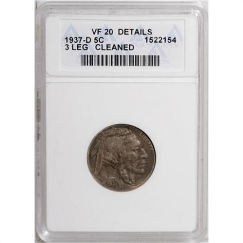 <B>1937-D 5C Three-Legged--Cleaned--ANACS. VF20 Details.</B></I> NGC Census: (59/3644). PCGS Population (116/4011). Mintage: 17,826,000. Numismedia Wsl. Price for NGC/PCGS coin in VF20: $835. (#3982)<BR><BR><B>Coin Engraver:</B> James E. Fraser<BR><BR><b>Shipping:</b> Coins & Currency (<a target="_blank" href="http://www.heritageauctions.com/common/shipping.php">view shipping information</a>)