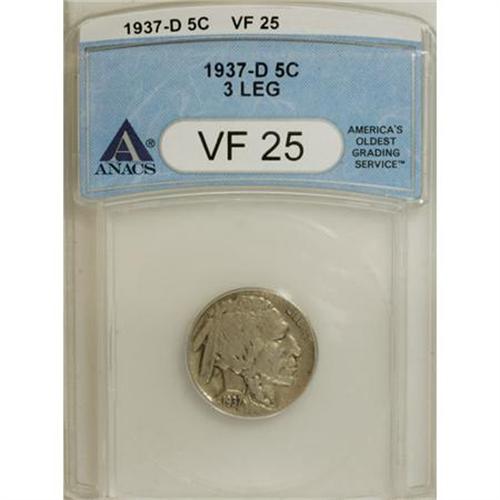 <B>1937-D 5C Three-Legged VF25 ANACS.</B></I> A moderately circulated representative of this popular Buffalo nickel variant, silver-gray with slightly deeper color near the devices. Minimally marked for the grade assigned and pleasing.<BR><BR><B>Coin Engraver:</B> James E. Fraser<BR><BR><b>Shipping:</b> Coins & Currency (<a target="_blank" href="http://www.heritageauctions.com/common/shipping.php">view shipping information</a>)