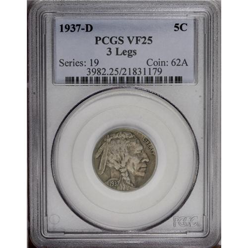 1937-D 5C Three-Legged VF25 PCGS. FS-020.2. A mid-grad 1937-D[5C] Three-Legged VF25 PCGS.