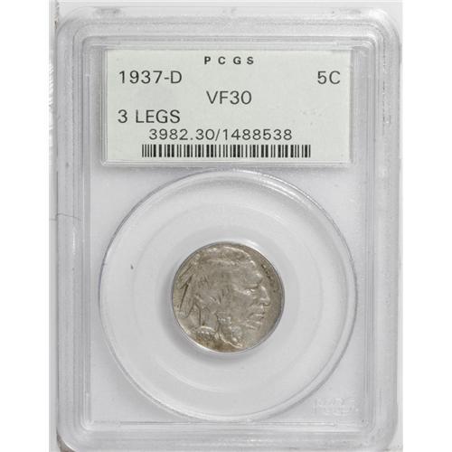 <B>1937-D<5C> Three-Legged VF30 PCGS.</B></I> Varied hues of gray show on both sides. Much of the device detail remains visible on this key-date piece, certified in a green-label holder.