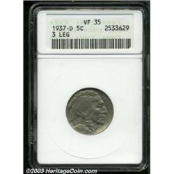 <TABLE cellSpacing=0 cellPadding=0 width="100%" bgColor=#000000 border=0><TBODY><TR><TD width="100%"><TABLE cellSpacing=1 cellPadding=3 width="100%" border=0><TBODY><TR><TD width="100%" bgColor=#79735c><FONT face=arial color=#ffffff size=3><B>Description</B> </FONT></TD></TR><TR><TD width="100%" bgColor=#ffffff><FONT face=arial size=2><B>1937-D 5C Three-Legged VF35 ANACS.</B></I> An average strike for the issue with a touch of light toning and the small marks one might expect of the grade. One of the more popular 20th century errors. </FONT></TD></TR></TBODY></TABLE></TD></TR></TBODY></TABLE><BR><A name=PricesRealized></A><TABLE cellSpacing=0 cellPadding=0 width="100%" bgColor=#000000 border=0><TBODY><TR><TD width="100%"><TABLE cellSpacing=1 cellPadding=3 width="100%" border=0><TBODY><TR><TD width="100%" bgColor=#79735c><A name=PR><FONT face=arial color=#ffffff size=3><B>Previous Prices from Heritage Auctions</B> </FONT></A></TD></TR><TR><TD bgColor=#f6f6ed><TABLE cellSpacing=0 cellPadding=0 width="100%" border=1><TBODY><TR><TD align=middle width="33%"><B>Date</B></TD><TD align=middle width="33%"><B>Service</B></TD><TD align=middle width="33%"><B>Price</B></TD></TR><TR bgColor=whitesmoke><TD width="33%"><B>02/24/2001</B></TD><TD width="33%">PCGS</TD><TD width="33%">$431.25</TD></TR><TR bgColor=whitesmoke><TD width="33%"><B>02/13/1998</B></TD><TD width="33%">PCGS</TD><TD width="33%">$341.00</TD></TR><TR bgColor=whitesmoke><TD width="33%"><B>05/31/2003</B></TD><TD width="33%">PCGS</TD><TD width="33%">$488.75</TD></TR><TR bgColor=whitesmoke><TD width="33%"><B>05/27/2003</B></TD><TD width="33%">ANACS</TD><TD width="33%">$327.75</TD></TR></TBODY></TABLE></TD></TR><TR><TD bgColor=#ffffff><FONT face=arial size=1 ?>PLEASE NOTE: All prices realized reflect the final hammer price PLUS the buyer's premium in auctions that charge a buyer's premium. Each item has a notation at the top of the listing indicating whether that lot included a buyer's premium. Example: A item that sells with a final hammer price of $100 and a 20% buyer's premium will display with a price realized of $120. All information listed is intended to be as accurate as possible, but errors are possible. Please use this guide carefully and inform us of any inaccuracies. </FONT></TD></TR></TBODY></TABLE></TD></TR></TBODY></TABLE><BR><TABLE cellSpacing=0 cellPadding=0 width="100%" bgColor=#000000 border=0><TBODY><TR><TD width="100%"><TABLE cellSpacing=1 cellPadding=3 width="100%" border=0><TBODY><TR><TD width="100%" bgColor=#79735c colSpan=6><FONT face=arial color=#ffffff size=3><B>Price Guide*</B> </FONT></TD></TR><TR bgColor=#f6f6ed><TD align=middle><B>Grade</B> </TD><TD align=middle><B>Coin World<BR>(Trends)</B> </TD><TD align=middle><B>Numismedia<BR>Retail</B> </TD><TD align=middle><B>Numismedia<BR>Wholesale</B> </TD><TD align=middle><B>Coin<BR>Universe</B> </TD><TD align=middle><B>Heritage<BR>Value Index</B> </TD></TR><TR bgColor=#ffffff><TD align=middle>30</TD><TD align=right>---</TD><TD align=right>---</TD><TD align=right>---</TD><TD align=right>$525.00</TD><TD align=right>$360.81</TD></TR><TR style="FONT-WEIGHT: bold" bgColor=#cccfdd><TD align=middle>35</TD><TD align=right>---</TD><TD align=right>---</TD><TD align=right>---</TD><TD align=right>---</TD><TD align=right>$372.47</TD></TR><TR bgColor=#ffffff><TD align=middle>40</TD><TD align=right>$700.00</TD><TD align=right>$580.00</TD><TD align=right>$483.00</TD><TD align=right>$600.00</TD><TD align=right>$426.63</TD></TR><TR bgColor=#ffffff><TD colSpan=6><FONT size=1>*All information listed is intended to be as accurate as possible, but errors are possible. No item may be returned or refused based on this information which is provided as a service to our customers. You should contact each pricing source directly to determine the accuracy of this information. </FONT></TD></TR></TBODY></TABLE></TD></TR></TBODY></TABLE><BR><TABLE cellSpacing=0 cellPadding=0 width="100%" bgColor=#000000 border=0><TBODY><TR><TD width="100%"><TABLE cellSpacing=1 cellPadding=3 width="100%" border=0><TBODY><TR><TD width="100%" bgColor=#79735c><FONT face=arial color=#ffffff size=3><B>Population Guide</B> </FONT></TD></TR><TR bgColor=#ffffff><TD align=middle><!-- Begin Output of Population Grid--><TABLE cellSpacing=0 cellPadding=0 width="100%" border=0><TBODY><TR><TD vAlign=center><TABLE cellSpacing=0 width="100%" border=1 cellsadding="3"><TBODY><TR><TD vAlign=center><TABLE cellSpacing=0 cellPadding=3 width="100%" border=1><TBODY><TR><TD vAlign=center align=middle bgColor=#f0f1e8 colSpan=2 <CENTER><FONT face=Arial size=2><B>PCGS Pop </B></FONT><CENTER></CENTER></TD><TD vAlign=center align=middle bgColor=#f0f1e8 colSpan=2><CENTER><FONT face=Arial size=2><B>NGC Pop</B></CENTER></FONT></TD></TR><TR><TD vAlign=center><FONT face=Arial size=2>(35)</FONT> </TD><TD vAlign=center align=right><FONT face=Arial size=2>127</FONT> </TD><TD vAlign=center><FONT face=Arial size=2>(35)</FONT> </TD><TD vAlign=center align=right><FONT face=Arial size=2>25</FONT> </TD></TR><TR><TD vAlign=center><FONT face=Arial size=2>(>35)</FONT> </TD><TD vAlign=center align=right><FONT face=Arial size=2>2569</FONT> </TD><TD vAlign=center><FONT face=Arial size=2>(>35)</FONT> </TD><TD vAlign=center align=right><FONT face=Arial size=2>1936</FONT> </TD></TR></TBODY></TABLE></TD></TR></TBODY></TABLE></TD></TR></TBODY></TABLE><!-- End Output of Population Grid--> Important notice: Heritage usually auctions material at the rate of 200-250 lots per hour. On some occasions eBay Live bid software or the Internet may not be able to keep up with the pace of the auction. We recommend placing a realistic absentee bid now as insurance to avoid disappointment. Occasionally the auctioneer may eliminate or reject an eBay Live bid, and the auctioneer may also reopen a lot after the close of the eBay live bidding (usually because we missed an audience bid), and may reject your bid even if it shows you as the winning bidder. By bidding via eBay Live, you agree 
