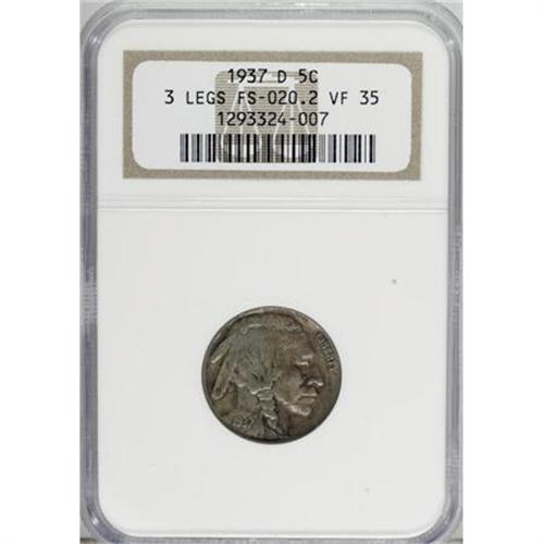 <B>1937-D 5C Three-Legged VF35 NGC.</B></I> FS-020.2. Moderately worn with drab reddish-brown and gray coloration and a handful of noticeable marks on each side. A Choice VF example of everybody's favorite Buffalo nickel variety. <BR><BR><b>Shipping:</b> Coins & Currency (<a target="_blank" href="http://www.heritageauctions.com/common/shipping.php">view shipping information</a>)