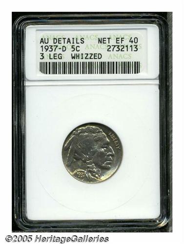 <B>1937-D<5C> Three-Legged--Whizzed--ANACS. AU Details, Net XF40.</B></I> An unnaturally bright and lustrous pale canary-gold key date Nickel. The horn is full, and the cheekbone and hipbone show only slight wear.