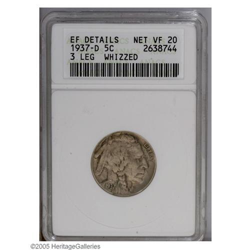 <B>1937-D<5C> Three-Legged--Whizzed--ANACS. XF Details, Net VF20.</B></I> The surfaces, while exhibiting most of their original design details, are unnaturally glossy and somewhat unevenly worn, from whizzing. A number of small abrasions are noticeable on the bison.