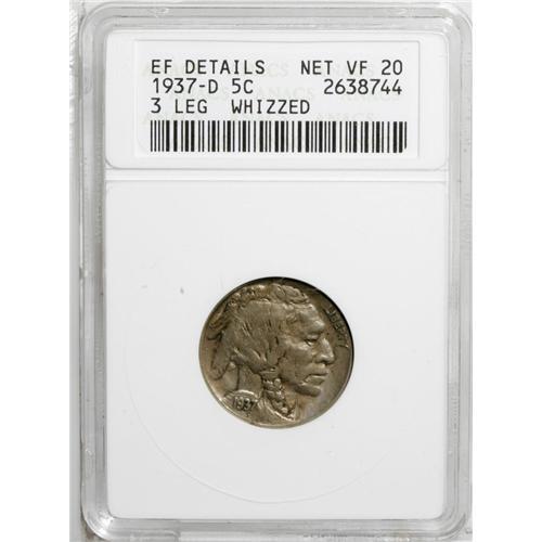 <B>1937-D<5C> Three-Legged--Whizzed--ANACS. XF Details, Net VF20.</B></I> The surfaces, while exhibiting most of their original design details, are unnaturally glossy and somewhat unevenly worn, from whizzing. A number of small abrasions are noticeable on the bison.
