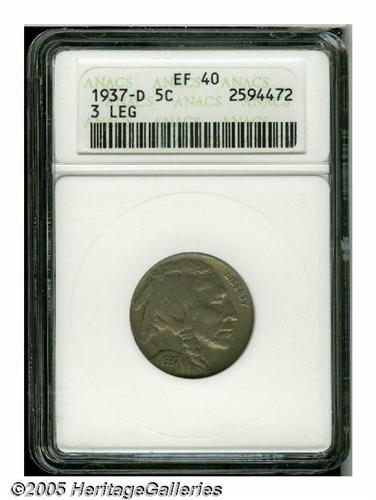 <B>1937-D<5C> Three-Legged XF40 ANACS.</B></I> FS-020.2. A lightly circulated steel-gray and tan example of this popular key date Nickel. A few specks of verdigris are noted on the reverse border between 12 and 3 o'clock.