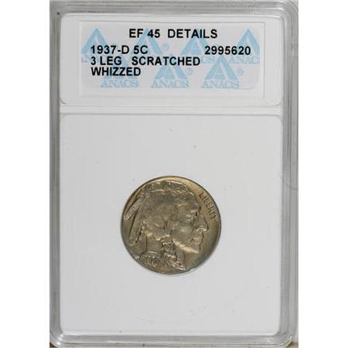 <B>1937-D 5C Three-Legged--Scratched, Whizzed--ANACS. XF45 Details.</B></I> NGC Census: (143/3252). PCGS Population (323/3234). Mintage: 17,826,000. Numismedia Wsl. Price for NGC/PCGS coin in XF40: $975. (#3982)<BR><BR><B>Coin Engraver:</B> James E. Fraser<BR><BR><b>Shipping:</b> Coins & Currency (<a target="_blank" href="http://www.heritageauctions.com/common/shipping.php">view shipping information</a>)