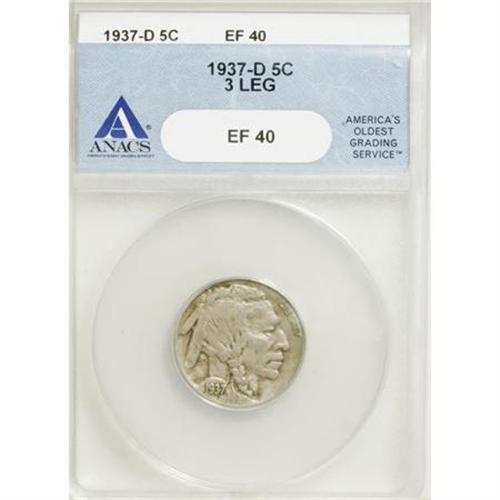 <B>1937-D 5C Three-Legged XF40 ANACS.</B></I> FS-020.2 Light to medium gray nickel-gray surfaces are quite clean, and the design elements have been well brought up. A rather pleasing example of this popular variety.<BR><BR><B>Coin Engraver:</B> James E. Fraser<BR><BR><b>Shipping:</b> Coins & Currency (<a target="_blank" href="http://www.heritageauctions.com/common/shipping.php">view shipping information</a>)