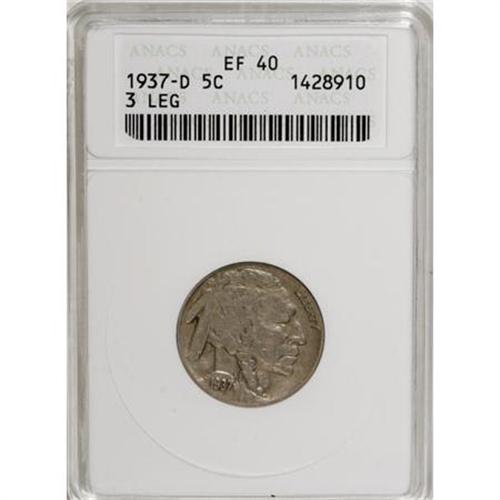 <B>1937-D 5C Three-Legged XF40 ANACS.</B></I> FS-020.2. The olive-gray surfaces are very clean and problem-free. The only problem is that the buffalo on the reverse has three legs rather than four; a problem that collectors are more than willing to deal with and the characteristic of the variety that makes this coin special. <BR><BR><B>Coin Engraver:</B> James E. Fraser<BR><BR><b>Shipping:</b> Coins & Currency (<a target="_blank" href="http://www.heritageauctions.com/common/shipping.php">view shipping information</a>)