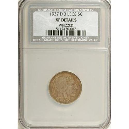 <B>1937-D 5C 3 Legs--Whizzed--NCS. XF Details.</B></I><BR><BR><B>Coin Engraver:</B> James E. Fraser<BR><BR><b>Shipping:</b> Coins & Currency (<a target="_blank" href="http://www.heritageauctions.com/common/shipping.php">view shipping information</a>)