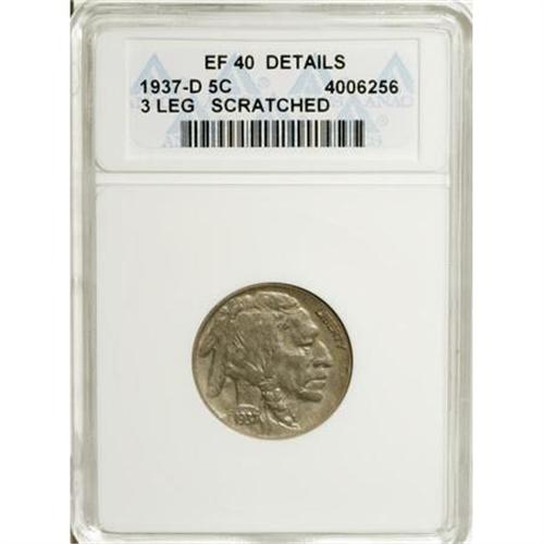 <B>1937-D 5C Three-Legged--Scratched--ANACS. XF40 Details.</B></I> The lower reverse has a few pinscratches from an idle hour long ago. A satiny key date nickel with subtle chestnut and ice-blue toning.<BR><BR><B>Coin Engraver:</B> James E. Fraser<BR><BR><b>Shipping:</b> Coins & Currency (<a target="_blank" href="http://www.heritageauctions.com/common/shipping.php">view shipping information</a>)