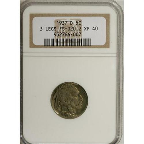 1937-D 5C Three-Legged XF40 NGC. FS-020.2. Rich olive and dolphin-gray patina saturates both sides of this lightly circulated and pleasing Three-Legged nickel. Struck from significantly eroded dies, though the series of raised die lumps below the bison's body is incomplete.<BR><BR><B>Coin Engraver:</B> James E. Fraser<BR><BR><b>Shipping:</b> Coins & Currency (<a target="_blank" href="http://www.heritageauctions.com/common/shipping.php">view shipping information</a>)
