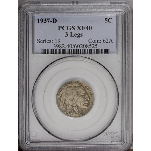 1937-D 5C Three-Legged XF40 PCGS. FS-020.2. A moderate 1937-D[5C] Three-Legged XF40 PCGS.