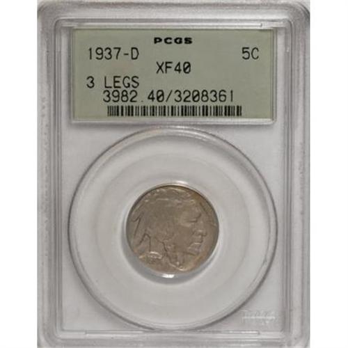<B>1937-D 5C Three-Legged XF40 PCGS.</B></I> A moderately abraded dove-gray and sea-green key date nickels. Die lumps are faintly visible beneath the bison's flank, and these are characteristic of the variety. Encased in an old green label holder.<BR><BR><B>Coin Engraver:</B> James E. Fraser<BR><BR><b>Shipping:</b> Coins & Currency (<a target="_blank" href="http://www.heritageauctions.com/common/shipping.php">view shipping information</a>)