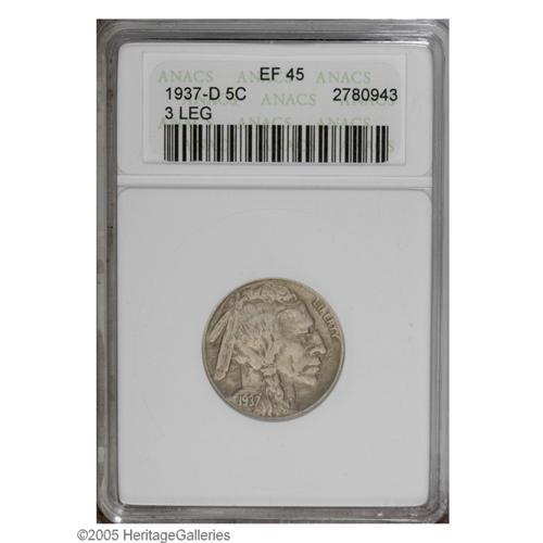 1937-D 5C Three-Legged XF45 ANACS. FS-020.2. A moderat 1937-D[5C] Three-Legged XF45 ANACS.