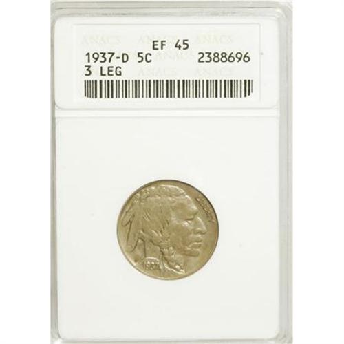 <B>1937-D 5C Three-Legged XF45 ANACS.</B></I> Olive-gold and steel-gray embrace this moderately circulated and slightly glossy key date nickel. The horn is full, and the only noticeable mark is on the bison's flank. <BR><BR><B>Coin Engraver:</B> James E. Fraser<BR><BR><b>Shipping:</b> Coins & Currency (<a target="_blank" href="http://www.heritageauctions.com/common/shipping.php">view shipping information</a>)