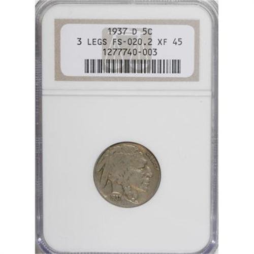 <B>1937-D 5C Three-Legged XF45 NGC.</B></I> FS-020.2. This attractive example displays very smooth surfaces that are evenly worn and still exhibit noticeable luster remnants. Both sides have a sort of creamy-gray appearance. A handful of small abrasions are noted on the bison. <BR><BR><b>Shipping:</b> Coins & Currency (<a target="_blank" href="http://www.heritageauctions.com/common/shipping.php">view shipping information</a>)