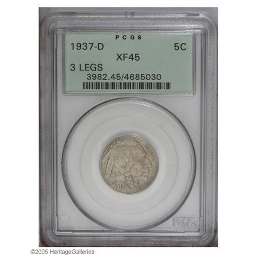<B>1937-D<5C> Three-Legged XF45 PCGS.</B></I> Gray colored throughout with numerous slide marks on the reverse that prevent a finer grade. Worth a look. Housed in an older PCGS holder.
