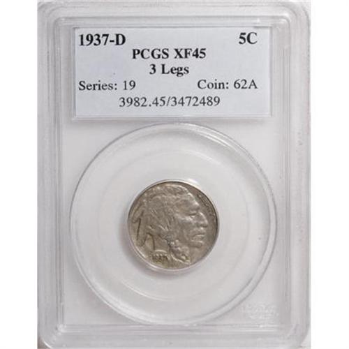 <B>1937-D 5C Three-Legged XF45 PCGS.</B></I> FS-020.2. This piece seems like a nice example for the grade of the famous Three-Legged Buffalo nickel, a variety which even non-numismatists are familiar with. The obverse is especially well detailed, and both sides display only typical wear and minor surface blemishes.<BR><I>From The Casa Becca del Norté Collection.</B></I><BR><BR><B>Coin Engraver:</B> James E. Fraser<BR><BR><b>Shipping:</b> Coins & Currency (<a target="_blank" href="http://www.heritageauctions.com/common/shipping.php">view shipping information</a>)