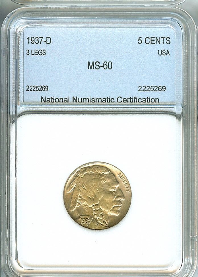 1937-D BUFFALO 5 CENTS - 3 LEGS- NNC MS-60 VERY RARE!