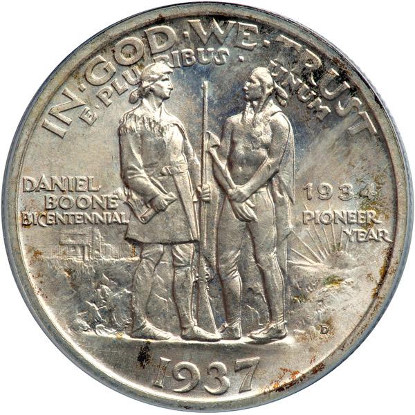 1937-D Boone Half Dollar. PCGS graded MS-66 PQ. Lovely natural toning on both sides. Stored in an old Raymond folder for over 60 years (PCGS # 9271) .