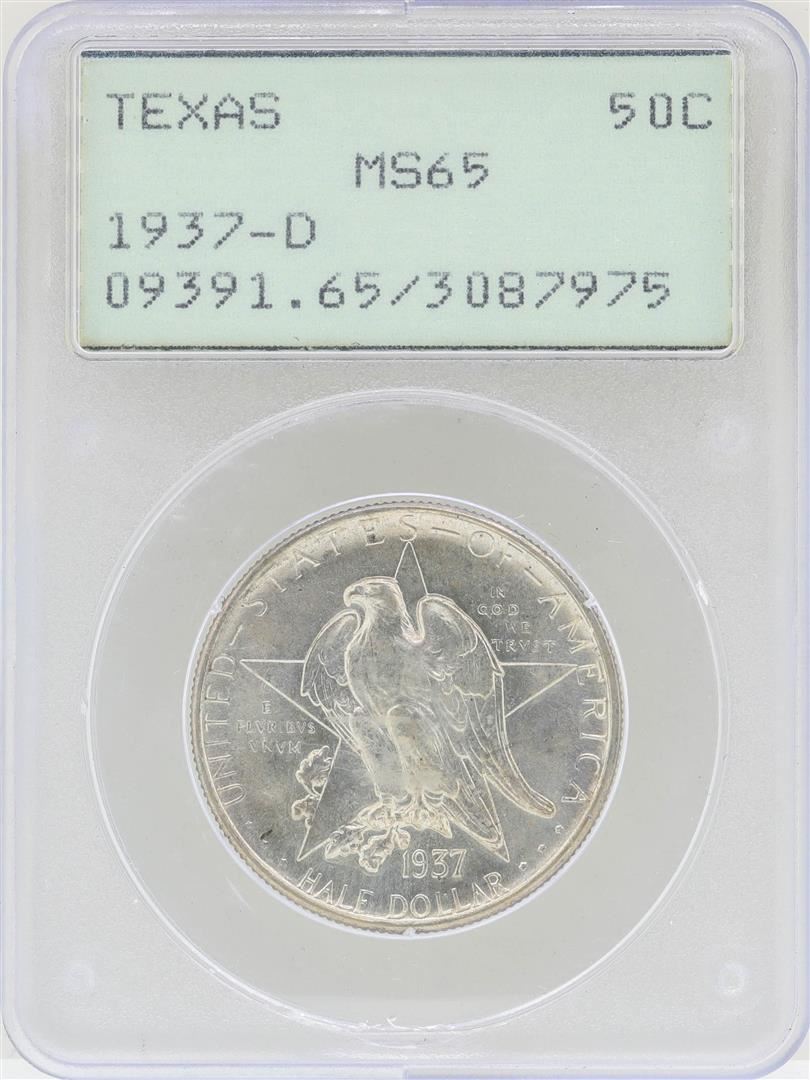 One 1937-D Texas Commemorative Half Dollar Coin PCGS MS65 Rattler. PCGS Graded.
