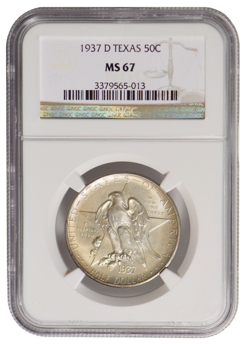 One 1937-D Texas Commemorative Half Dollar NGC MS67.
