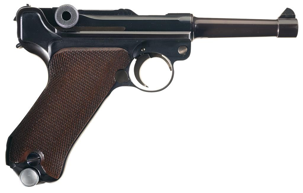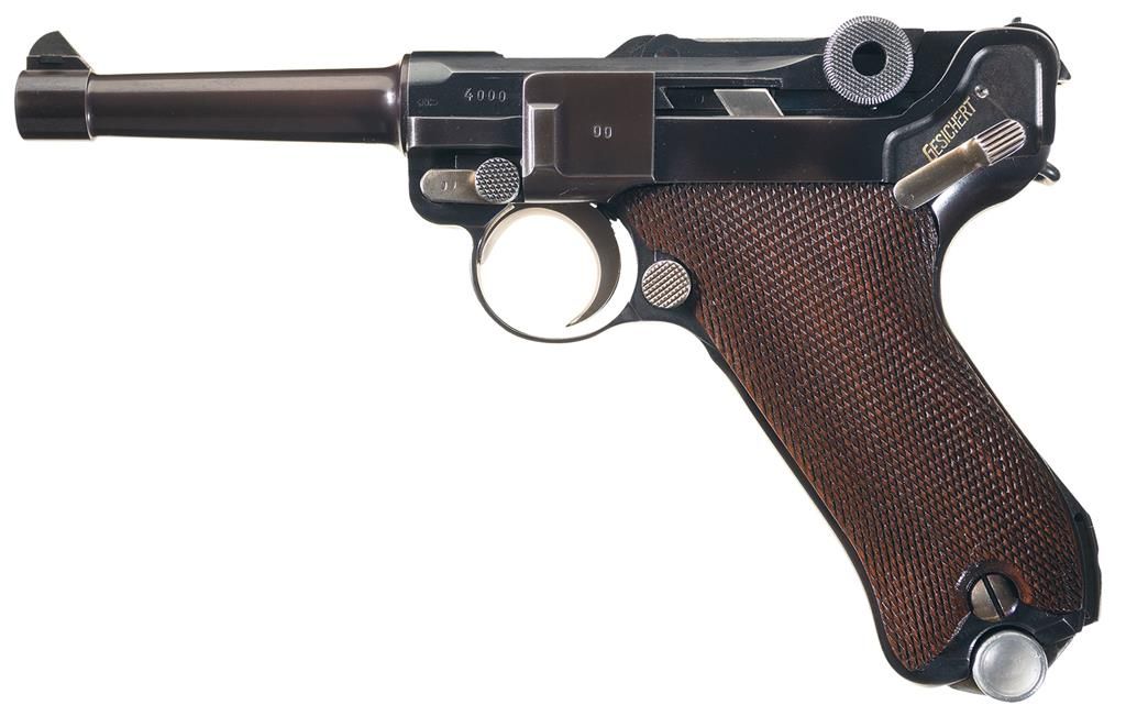 This is an example of a very a scarce mid-production Commercial contract Mauser Banner Luger pistol chambered in 9 mm Luger. The top of the chamber is dated 1937 and it has the standard Mauser Banner trademark on the toggle. This pistol falls into the range of those generally considered as a standard commercial Luger that was neither intended for sales outside Germany or Europe, nor a military or Police contract. The left side of the barrel extension, the underside of the barrel and the left side of the breech block are all stamped with a single "Crown/U" commercial proof acceptance mark. The pistol is numbered in the military fashion with the desirable serial number of "4000" stamped on the front of the frame, underside of the barrel and the left side of the barrel extension with the last two digits "00" stamped on various small parts. Blue finish with straw colored small parts and fitted with checkered walnut grips marked "00" on the inside of each panel and a unmarked blue folded sheet metal magazine with an aluminum base marked with the full serial number "4000" on the bottom.