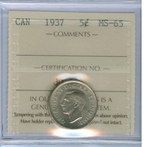 1937 Dot 5¢ ICCS MS65. Superb issue.