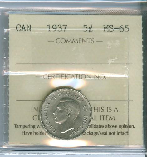 1937 Dot 5¢ ICCS MS65. Well struck but rather subdued example.