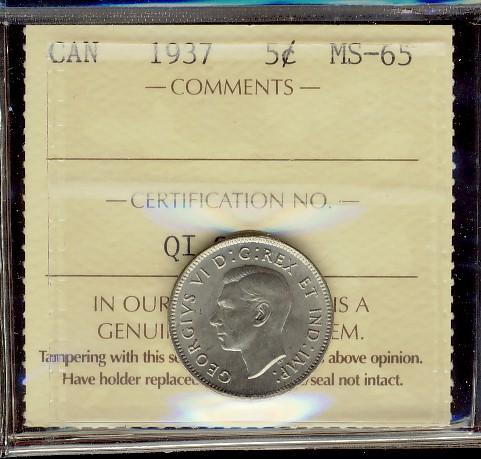 1937 Dot 5¢ ICCS MS65, superb Gem! Fully lustrous.