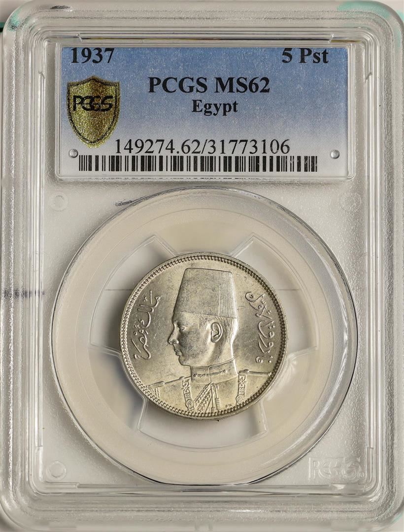 One 1937 Egypt 5 Piastres Silver Coin PCGS MS62. PCGS Graded.