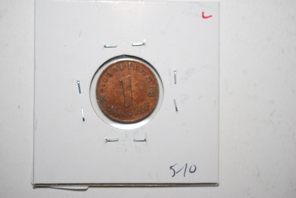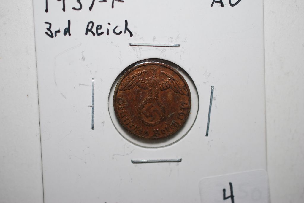 1937-F German 1 Reichspfennig Foreign Coin With Flying Eagle Holding Swatstika; AU; EST. $5-10