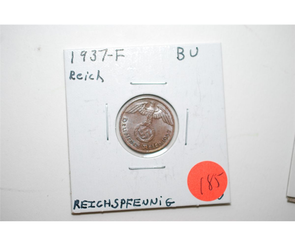 1937-F German 1 Reichspfennig Foreign Coin With Flying Eagle Holding Swatstika; BU; EST. $10-15