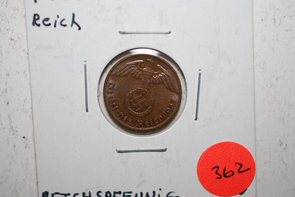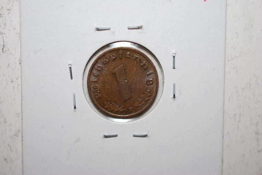 1937-F German 1 Reichspfennig Foreign Coin With Flying Eagle Holding Swatstika; BU; EST. $5-10