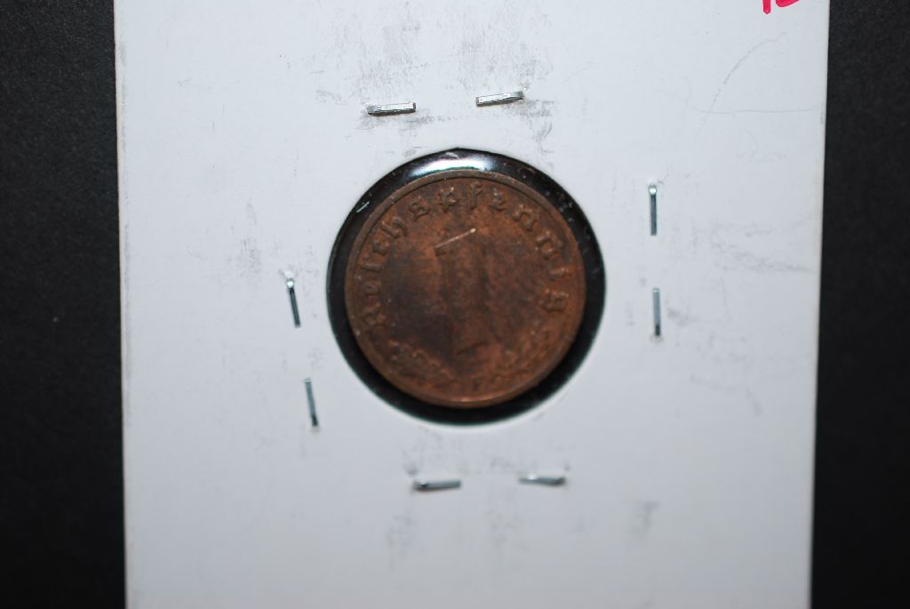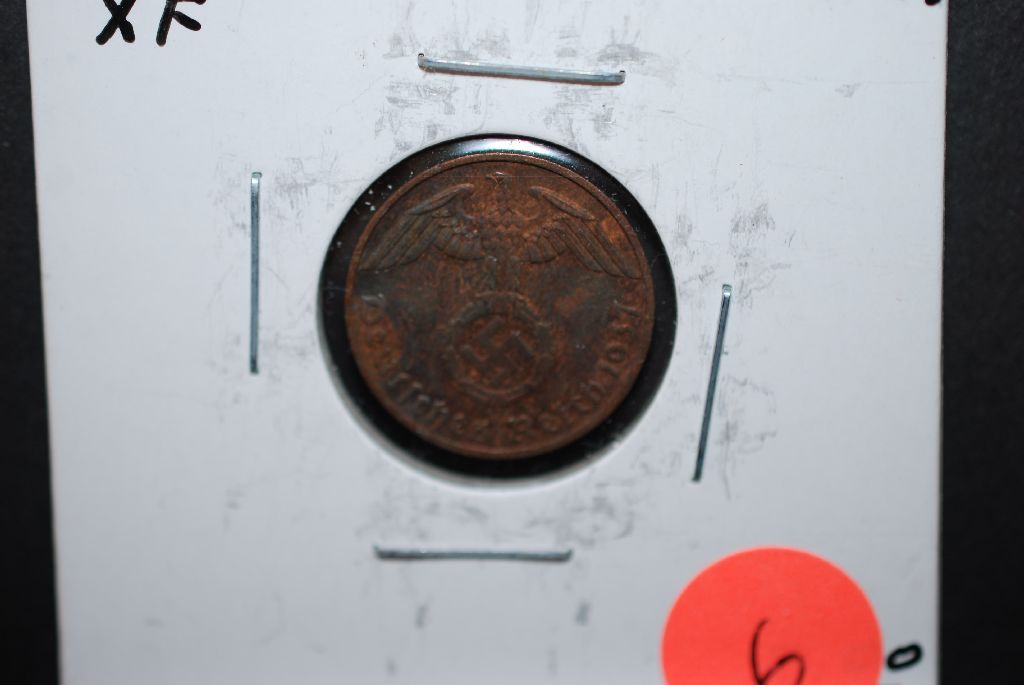 1937-F German 1 Reichspfennig Foreign Coin With Flying Eagle Holding Swatstika; XF; EST. $10-15