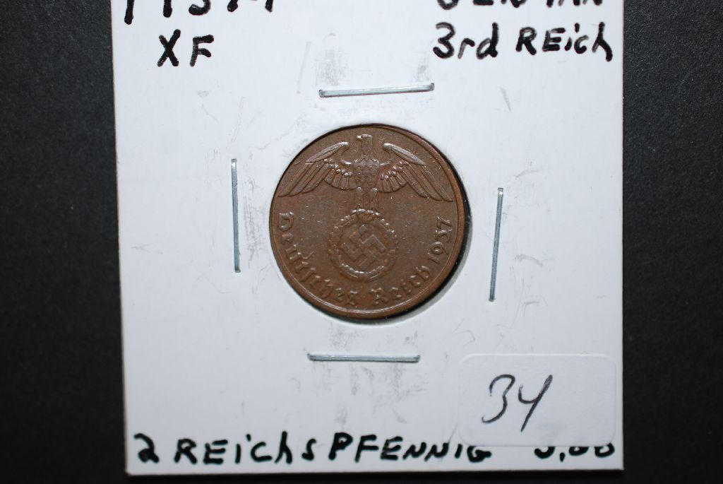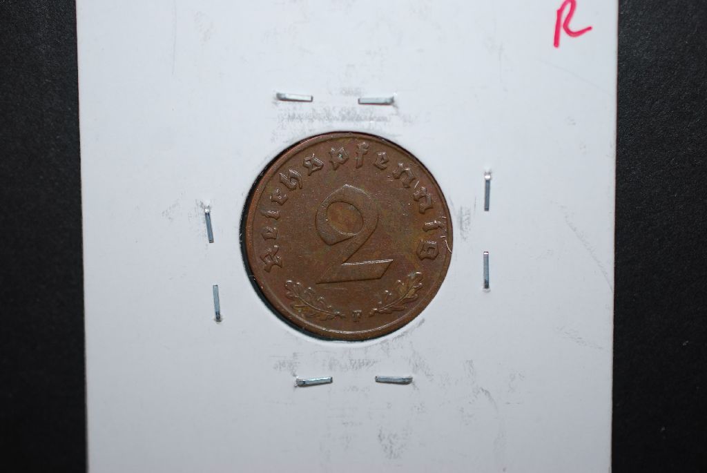 1937-F German 2 Reichspfennig Foreign Coin With Flying Eagle Holding Swatstika; XF; EST. $10-15