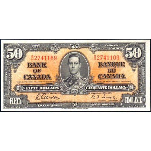 1937 Fifty Dollars, Gordon-Towers, BC-26b Serial Number B/H2741169, AU. A soft central bend and a bit off centre toward the left