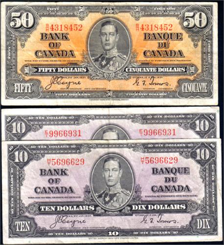 Bank of Canada 1937 Fifty Dollars, Coyne-Towers, BC-26c Serial Number B/H4318452 Fine and Ten Dollars, Coyne-Towers, BC-24c, two notes, both F-VF. Total three notes