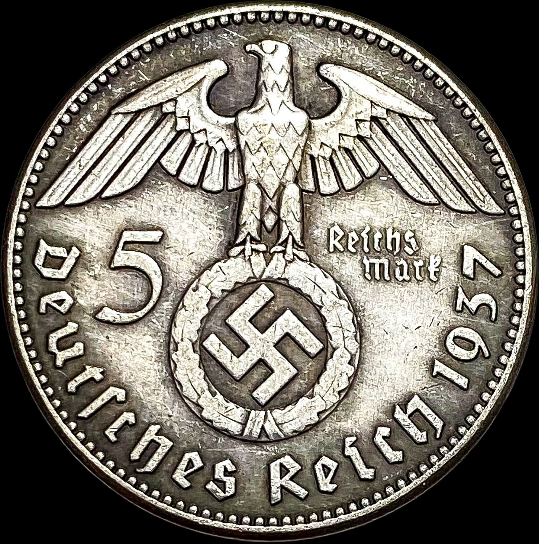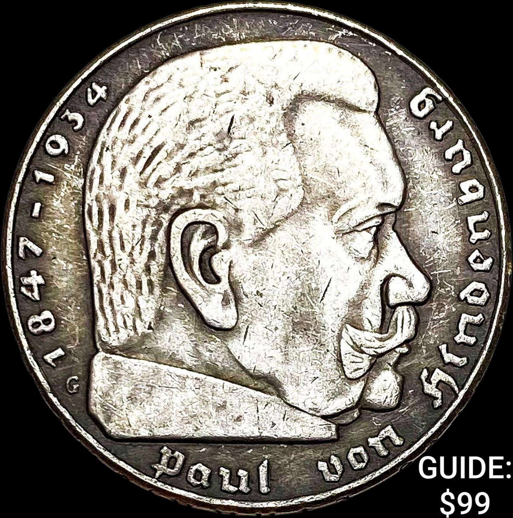 1937-G Germany Hindenburg Silver 5 Reichsmark CLOSELY UNCIRCULATED