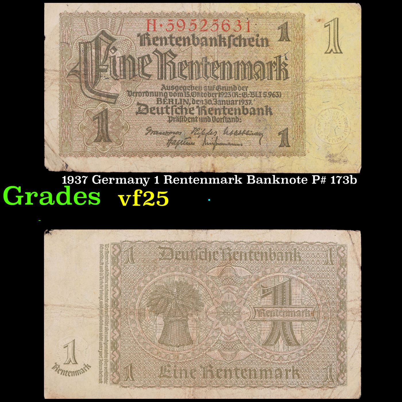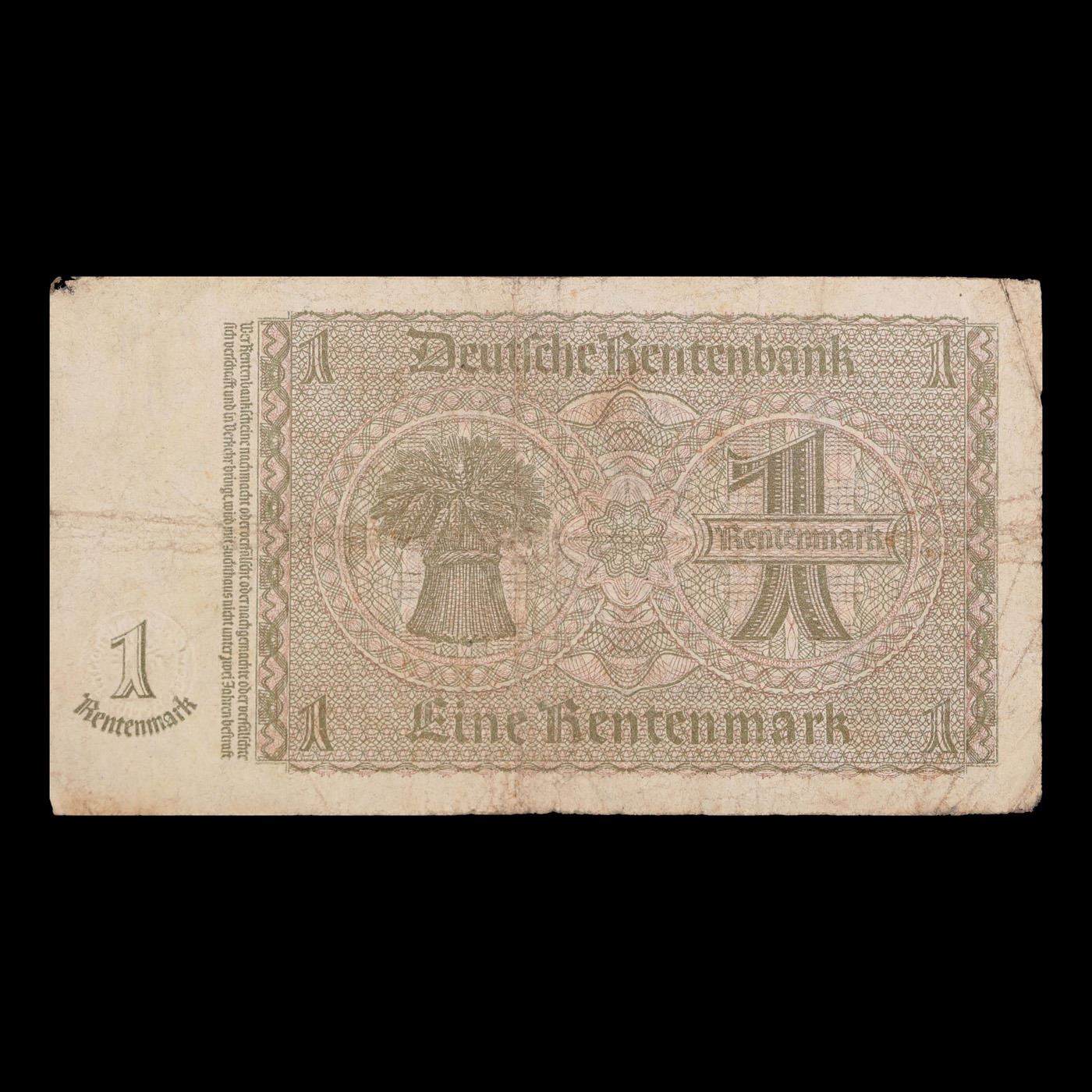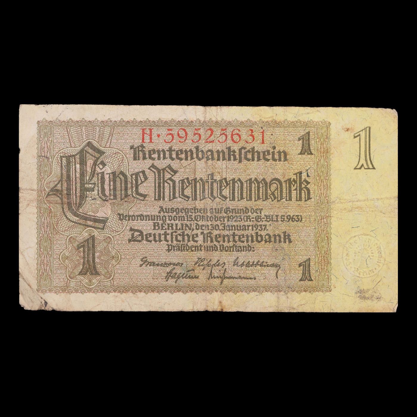 1937 Germany 1 Rentenmark Banknote P# 173b Grades vf+. The "Rentenmark" was issued in 1923 to help stop the hyperinflation in Weimar Germany after the "Paper Mark" had become worthless. Unlike the Goldmark, which was backed by gold, or the Papermark, which lacked the backing of a commodity, the Rentenmark was backed by the land used for agriculture and business. The Act creating the Rentenmark backed the currency by means of twice yearly payments on property, due in April and October, payable for five years. Although the Rentenmark was not initially legal tender, it was accepted by the population and its value was relatively stable.