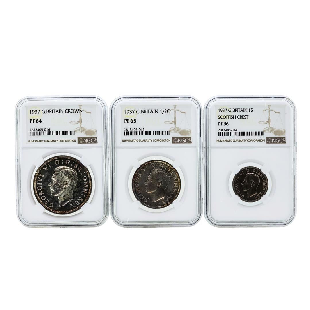 One 1937 Great Britain (3) Coin Proof Set NGC PF64/PF65/PF66. NGC Certified.