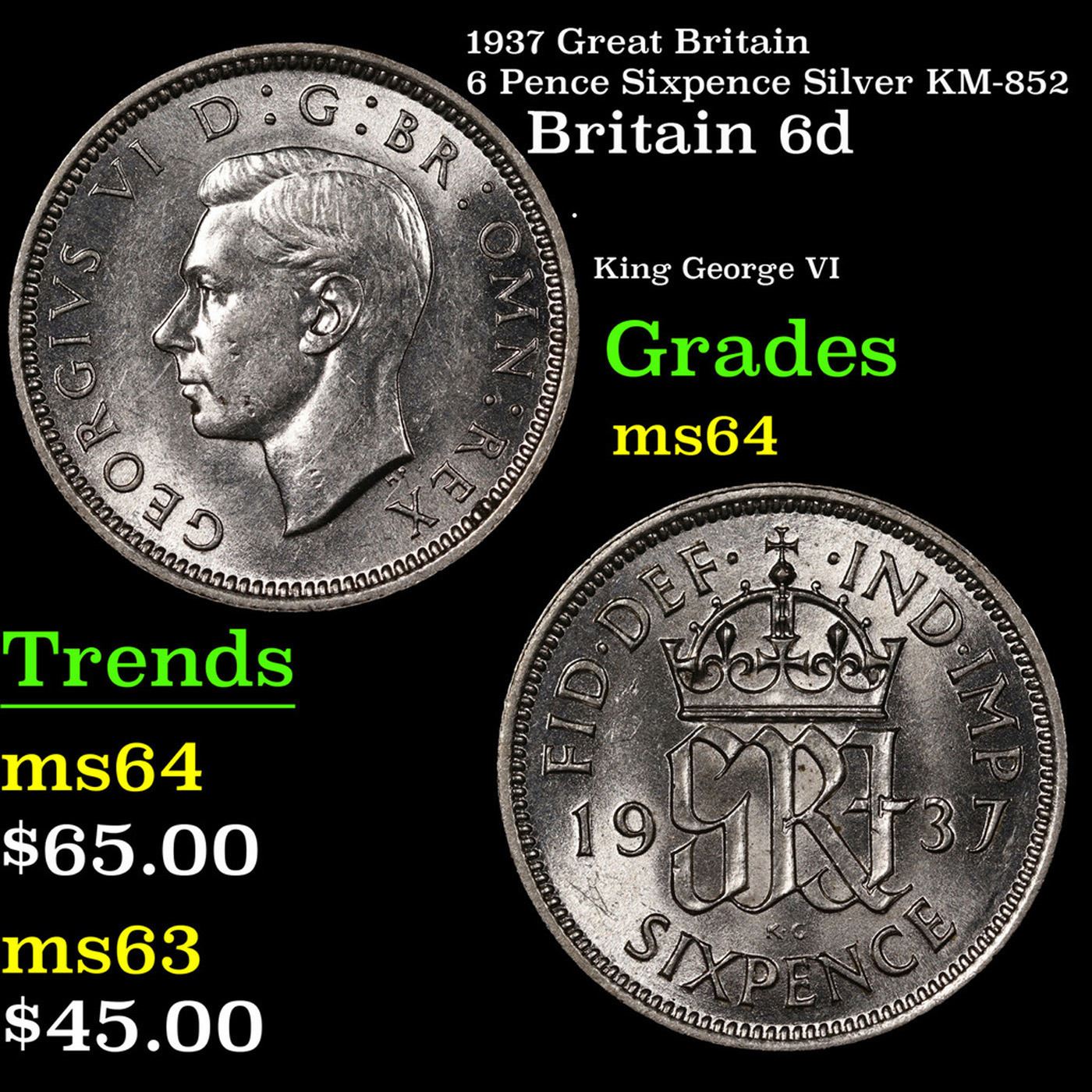 1937 Great Britain 6 Pence Sixpence Silver KM-852 Grades Choice Unc.