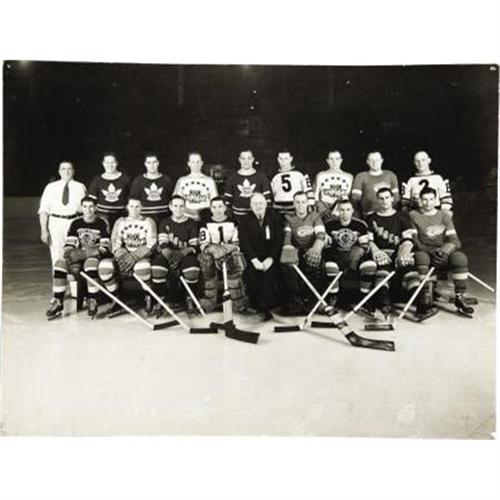 <B>1937 Howie Morenz Memorial All-Star Game Original Turofsky Photograph.</B></I> Brilliant piece of hockey history is seen here with this original photograph taken by the acclaimed sports photographer Turofsky. Dating from 1937, this 8x10" photo depicts the team of NHL All-Stars that took on a squad of Montreal Canadiens and Maroons in the Howie Morenz Memorial Game. One of the most-beloved players in the game at the time, Morenz passed away earlier in the year due to complications suffered after he broke his leg during a game in Montreal. Pictured in their team uniforms, the All-Stars include a bevy of Hall of Fame talent with such inclusions as Eddie Shore, Happy Day, Charlie Conacher, Gordon Drillon, Busher Jackson, Dit Clapper, Ebbie Goodfellow, Frank Boucher, Jack Adams and more. The pinholes at the corners are the only detractors from visual appeal, however they do little to lessen the overall appeal of this attractive vintage photo.<BR><BR><b>Shipping:</b> Flat Material, Small (<a target="_blank" href="http://www.heritageauctions.com/common/shipping.php">view shipping information</a>)