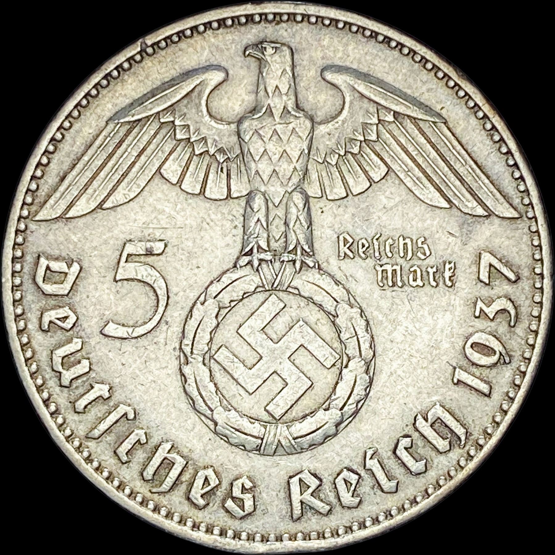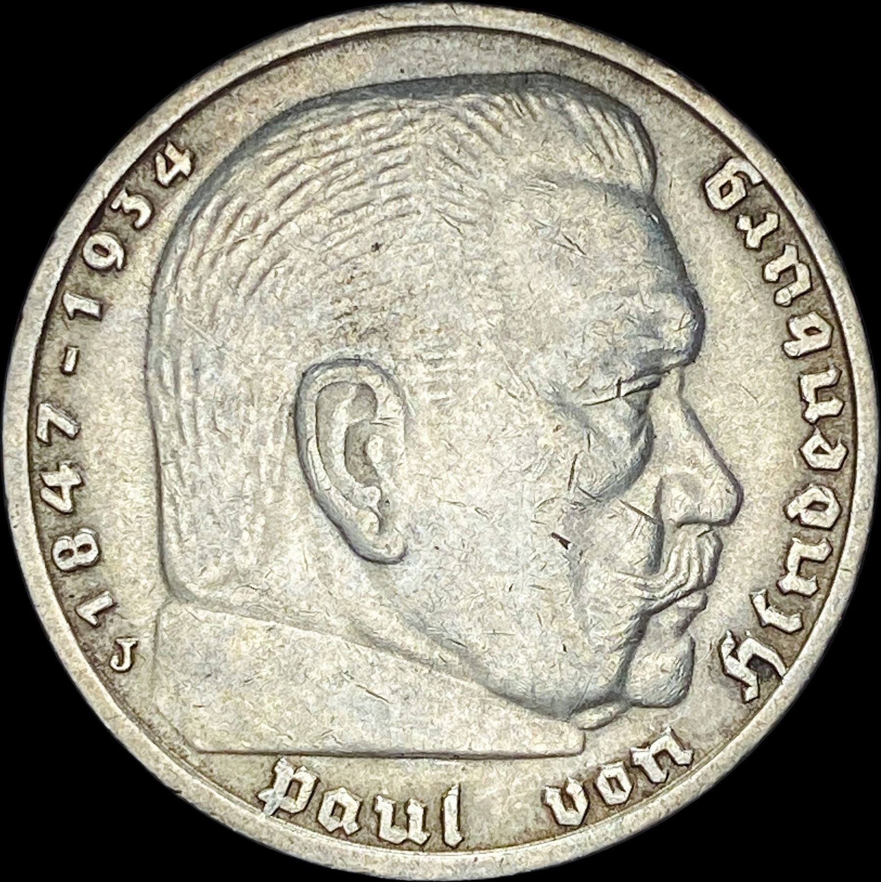 1937-J Germany Silver 5 Reichsmark CLOSELY UNCIRCULATED